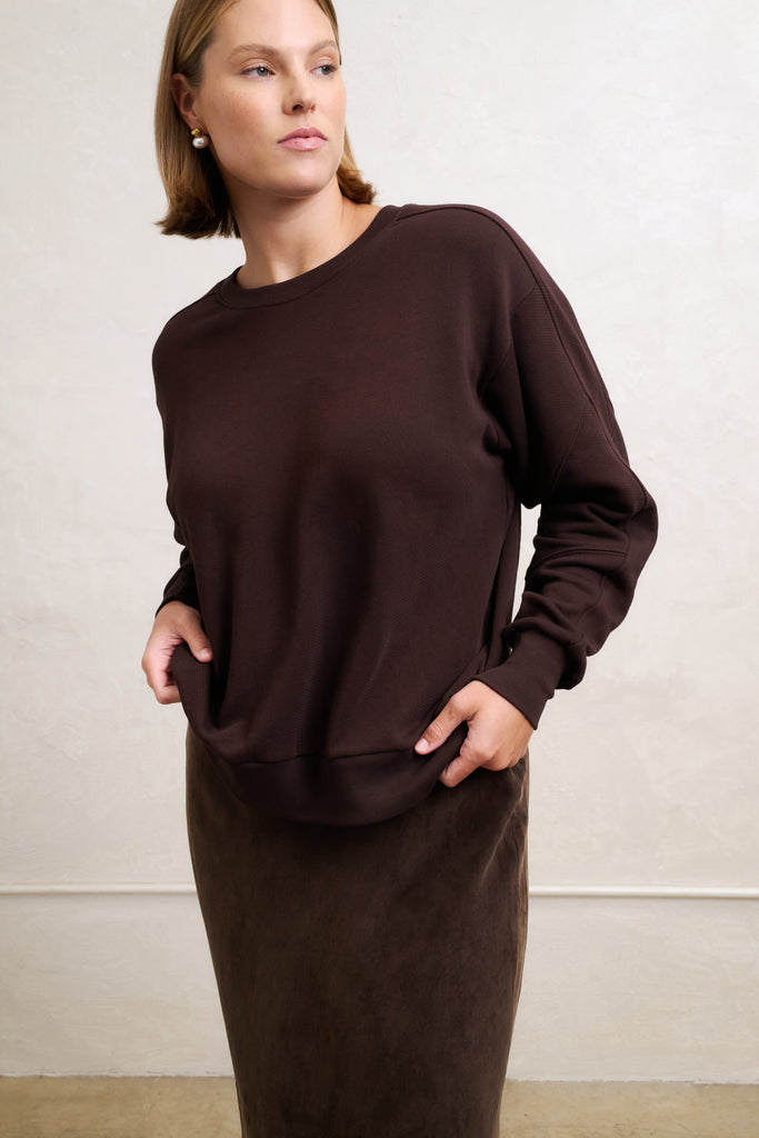 In soft French terry, this crew is a no-brainer must-have, a cozy season-spanning piece you'll reach for time and time again. It's basic, comfy, and designed with subtly dramatic sleeves and unique stitching detail for a little extra solika umph! Pair it with Sofia, Leila, and Nina Slip Skirt for comfy-chic feels!