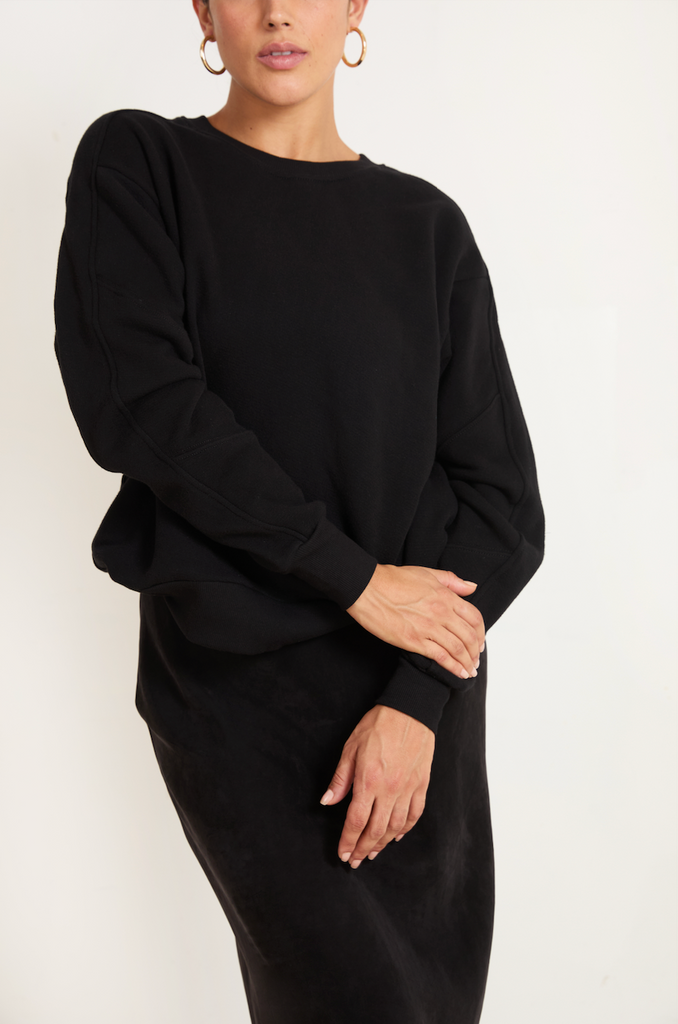 In soft French terry, this crew is a no-brainer must-have, a cozy season-spanning piece you'll reach for time and time again. It's basic, comfy, and designed with subtly dramatic sleeves and unique stitching detail for a little extra solika umph! Pair it with Sofia, Leila, and Nina Slip Skirt for comfy-chic feels!