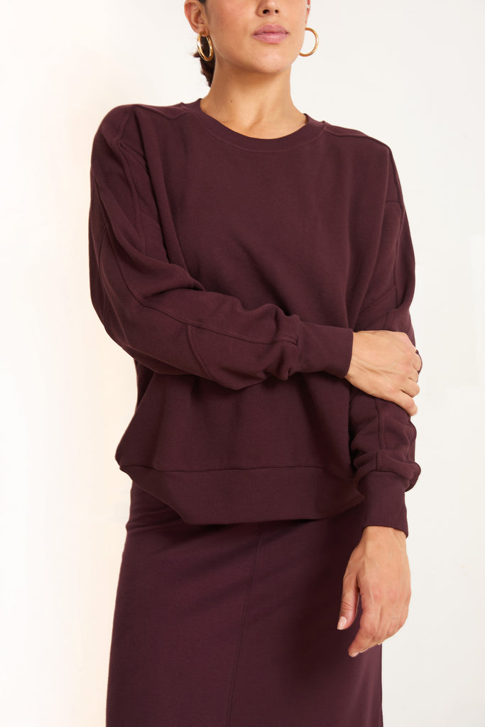 In soft French terry, this crew is a no-brainer must-have, a cozy season-spanning piece you'll reach for time and time again. It's basic, comfy, and designed with subtly dramatic sleeves and unique stitching detail for a little extra solika umph! Pair it with Sofia, Leila, and Nina Slip Skirt for comfy-chic feels!