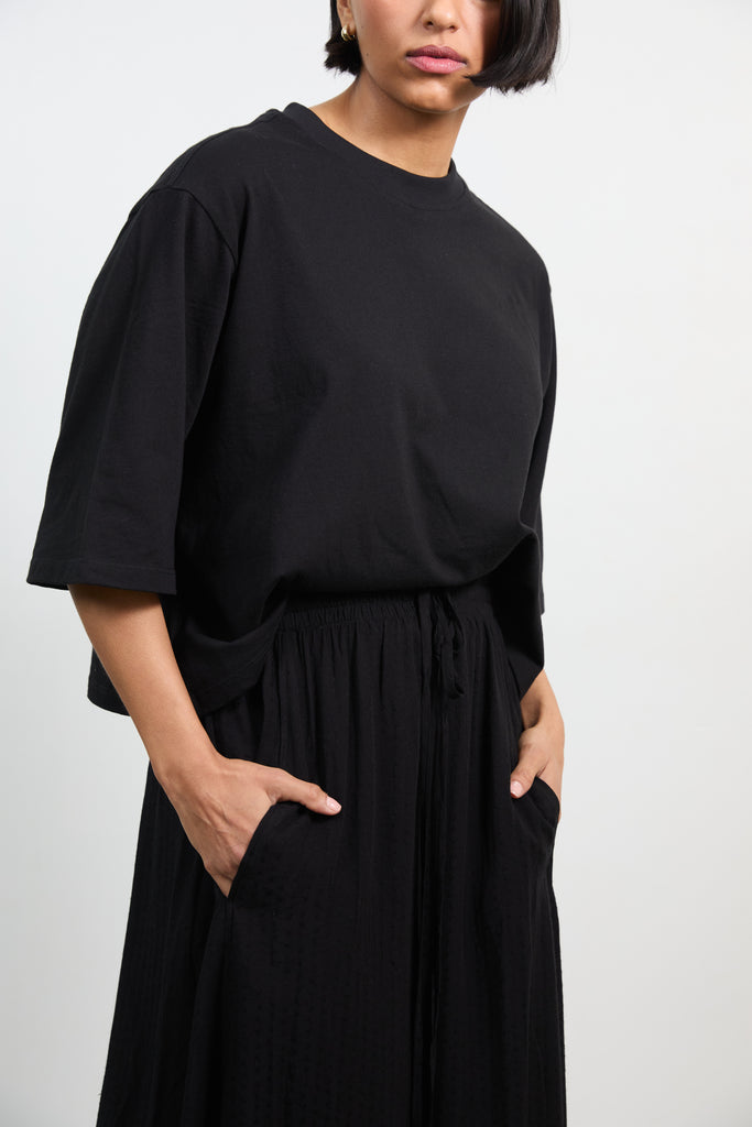 Made from 100% cotton, it’s lightweight, airy, breathable, and perfect for warm days. With its relaxed fit, simple crew neck, and modern square silhouette, this versatile top pairs easily with skirts, jeans, or anything in your closet. Effortlessly stylish and comfortable, the Eve Tee will quickly become a go-to in your wardrobe.