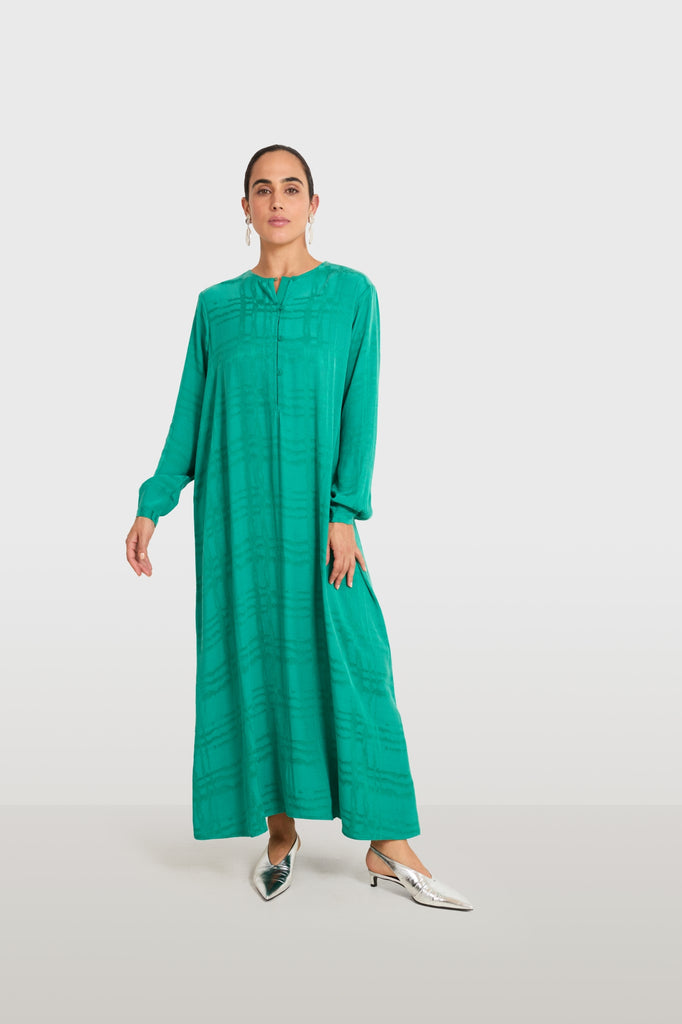 Featuring an elegant button placket for endless styling options, LIELLE can be worn open or closed to suit your mood. The soft, silky textured fabric drapes beautifully and brings a gentle sheen that enhances its bold color. Ready to be a showstopping Goddesss this season. Say hello to your new holiday dress in a color that stuns!