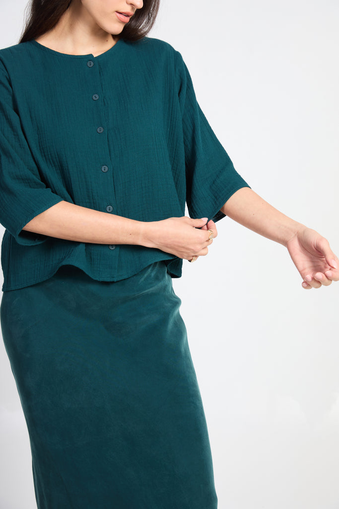Airy textured fabric adds to the casual ease of this button-front top framed with three-quarter sleeves from a soft cotton gauze. Wear Eda with our Leila Slip skirt or pair it with any skirt or jeans in your closet. Eda is a go-to essential for summer.