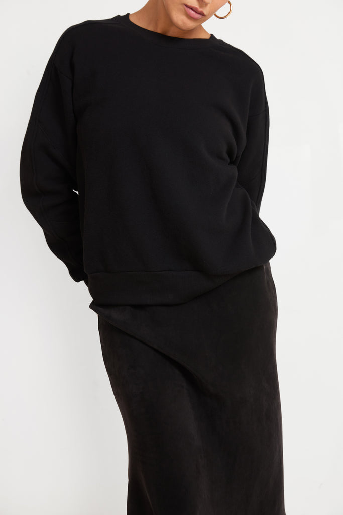 In soft French terry, this crew is a no-brainer must-have, a cozy season-spanning piece you'll reach for time and time again. It's basic, comfy, and designed with subtly dramatic sleeves and unique stitching detail for a little extra solika umph! Pair it with Sofia, Leila, and Nina Slip Skirt for comfy-chic feels!