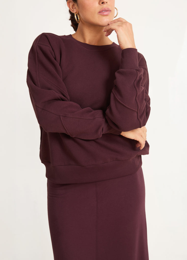 In soft French terry, this crew is a no-brainer must-have, a cozy season-spanning piece you'll reach for time and time again. It's basic, comfy, and designed with subtly dramatic sleeves and unique stitching detail for a little extra solika umph! Pair it with Sofia, Leila, and Nina Slip Skirt for comfy-chic feels!