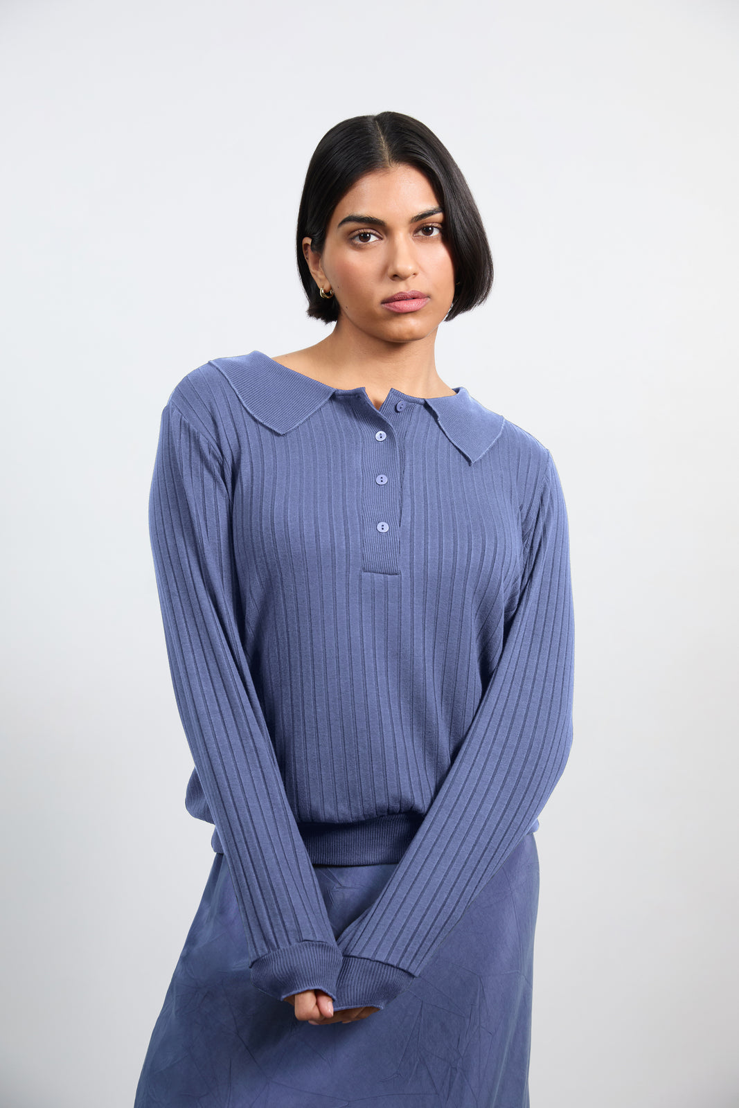 Inspired by our favorite Alaia midi, now reimagined as a top for those who love a matching set :) Introducing Ora — our signature rib-knit polo, crafted from luxe, soft fabric for all-day comfort and easygoing style. With its long sleeves and easy silhouette, Ora adds a polished, laid-back edge to any look—day or night.