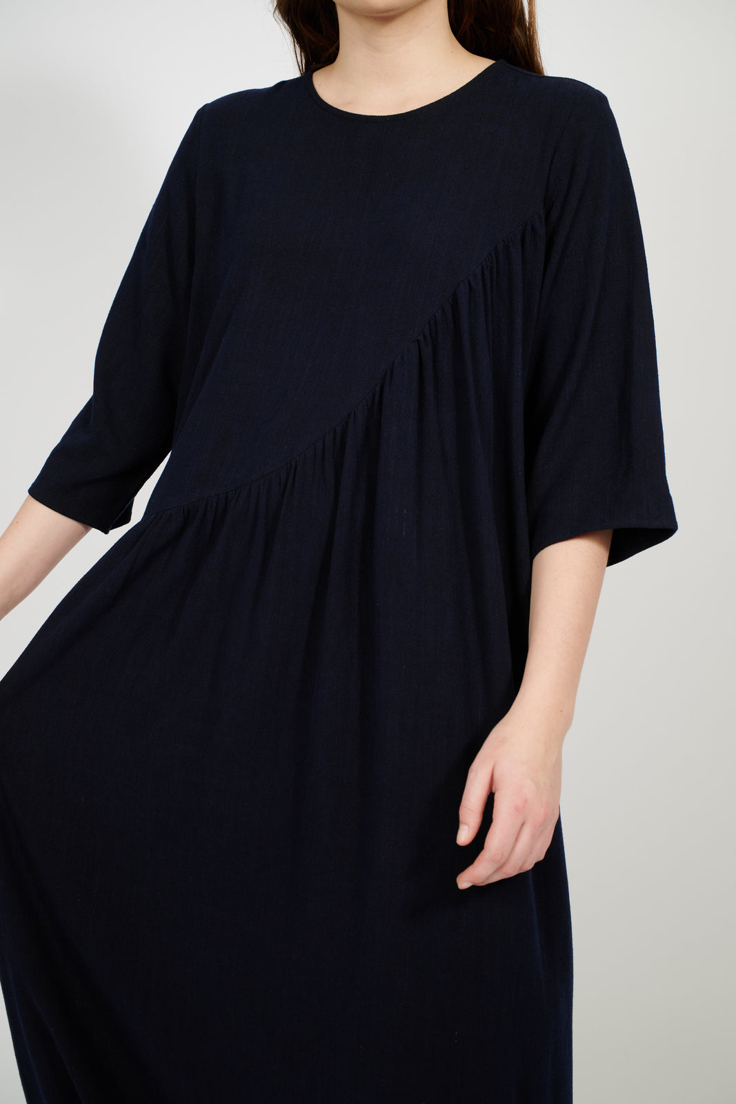 Designed to stand out in subtle ways. This breezy linen dress is defined by a diagonal ruched seam across the bust, with three-quarter sleeves and a lightweight feel perfect for spring through summer.